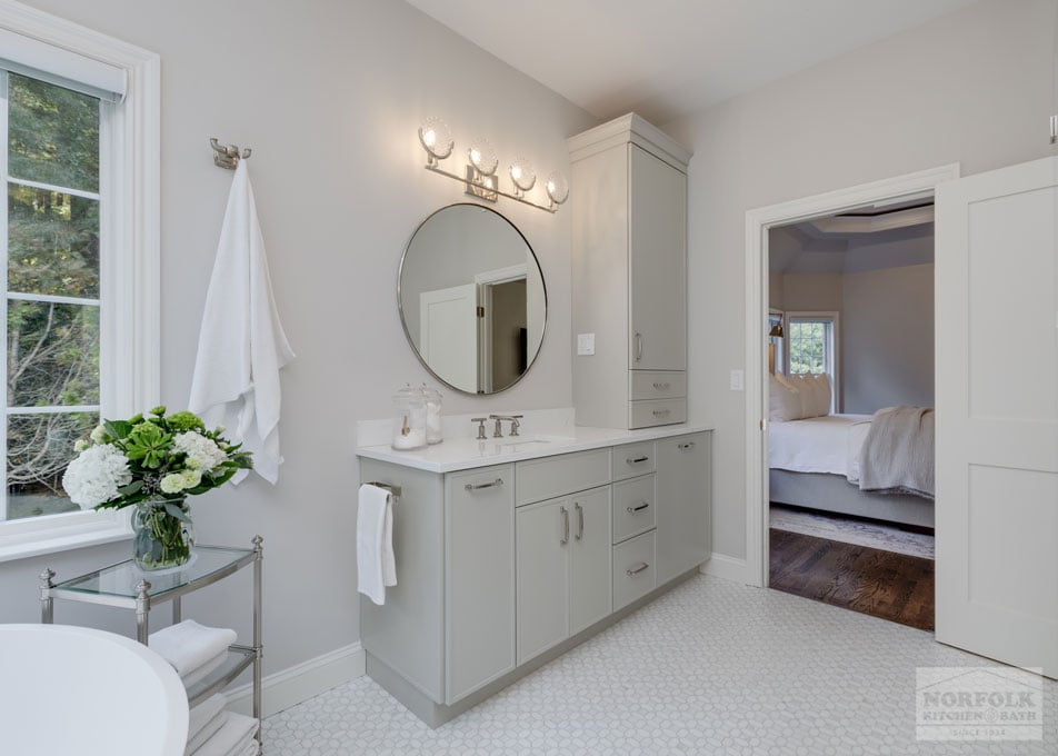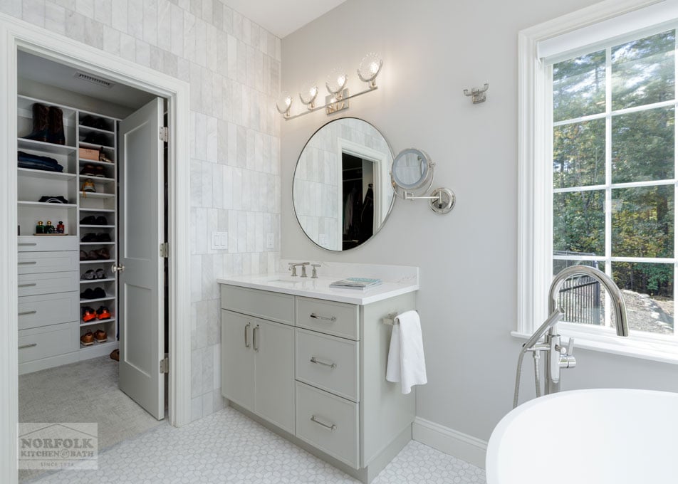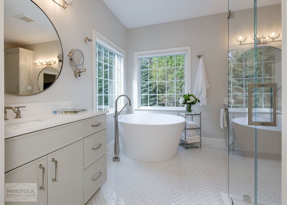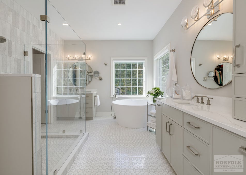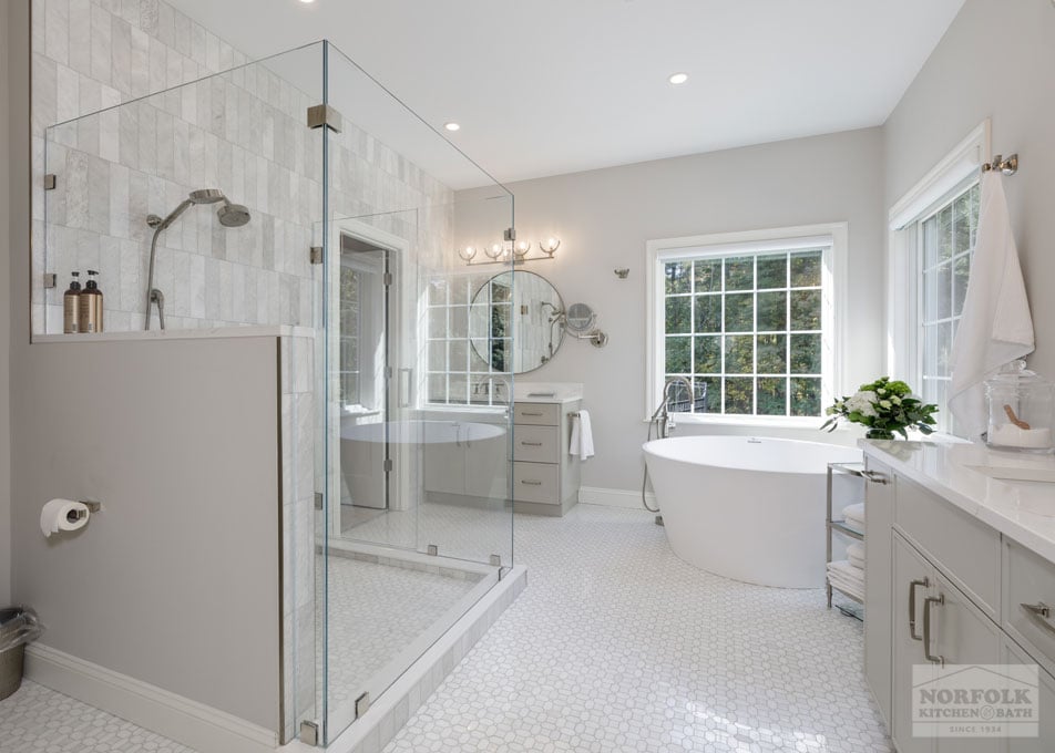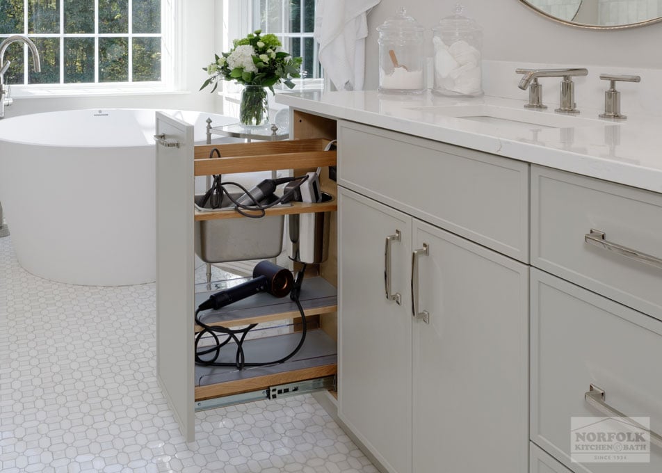 This stunning master bath, designed by Diane in our Manchester showroom, combines timeless elegance with modern practicality. The slim shaker cabinets in a soft Oyster finish complement the his-and-her vanities, offering both style and functionality. A free-standing tub adds a touch of luxury, while the spacious tiled shower provides a relaxing retreat. Thoughtful touches like the pull-out organizer drawers ensures everything stays neatly stored.