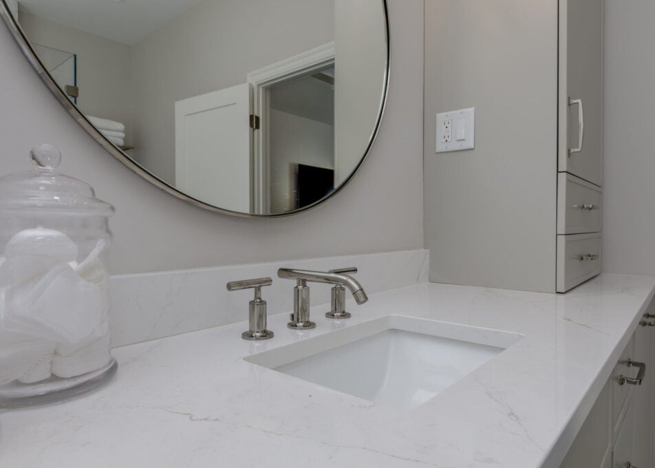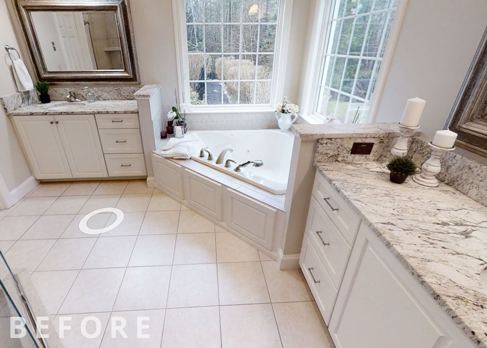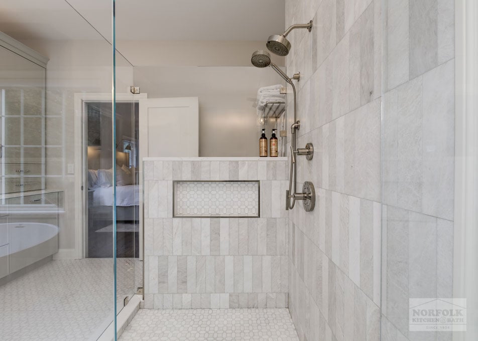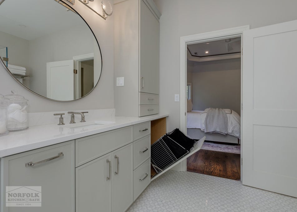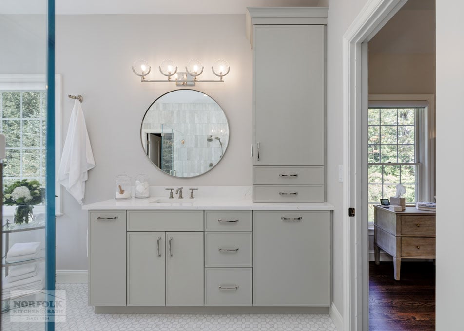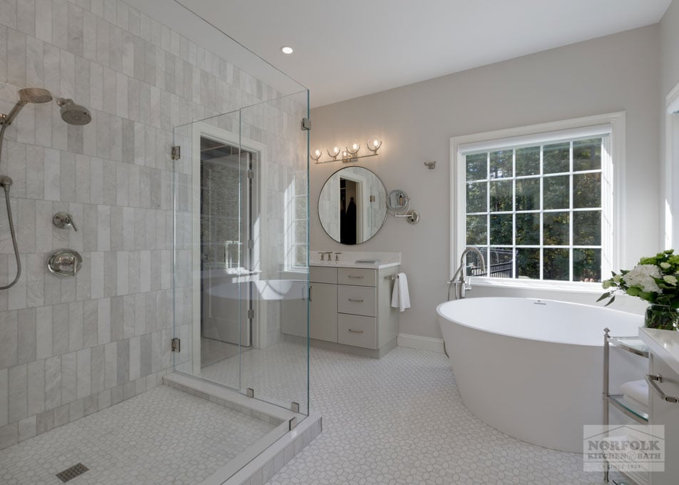 This stunning master bath, designed by Diane in our Manchester showroom, combines timeless elegance with modern practicality. The slim shaker cabinets in a soft Oyster finish complement the his-and-her vanities, offering both style and functionality. A free-standing tub adds a touch of luxury, while the spacious tiled shower provides a relaxing retreat. Thoughtful touches like the pull-out organizer drawers ensures everything stays neatly stored.