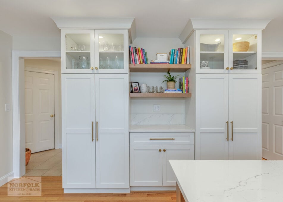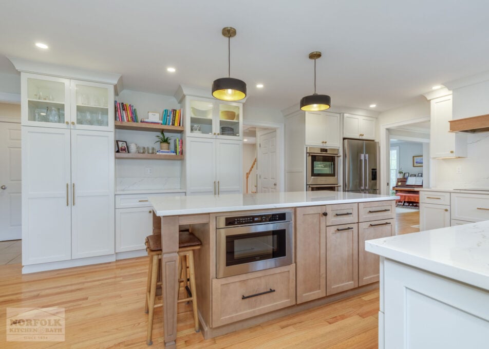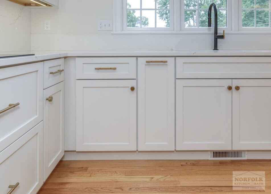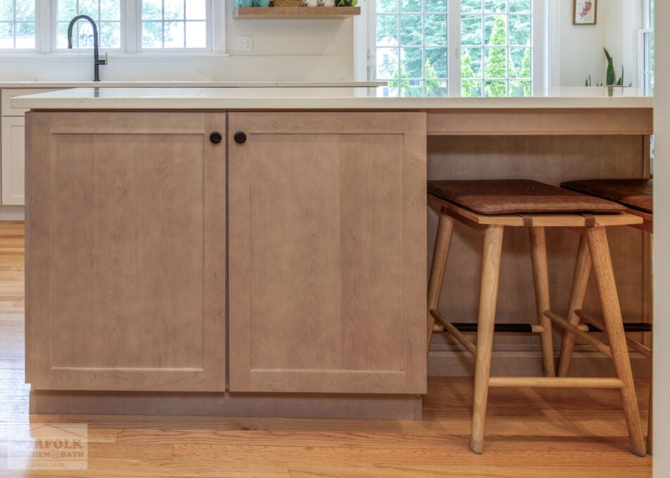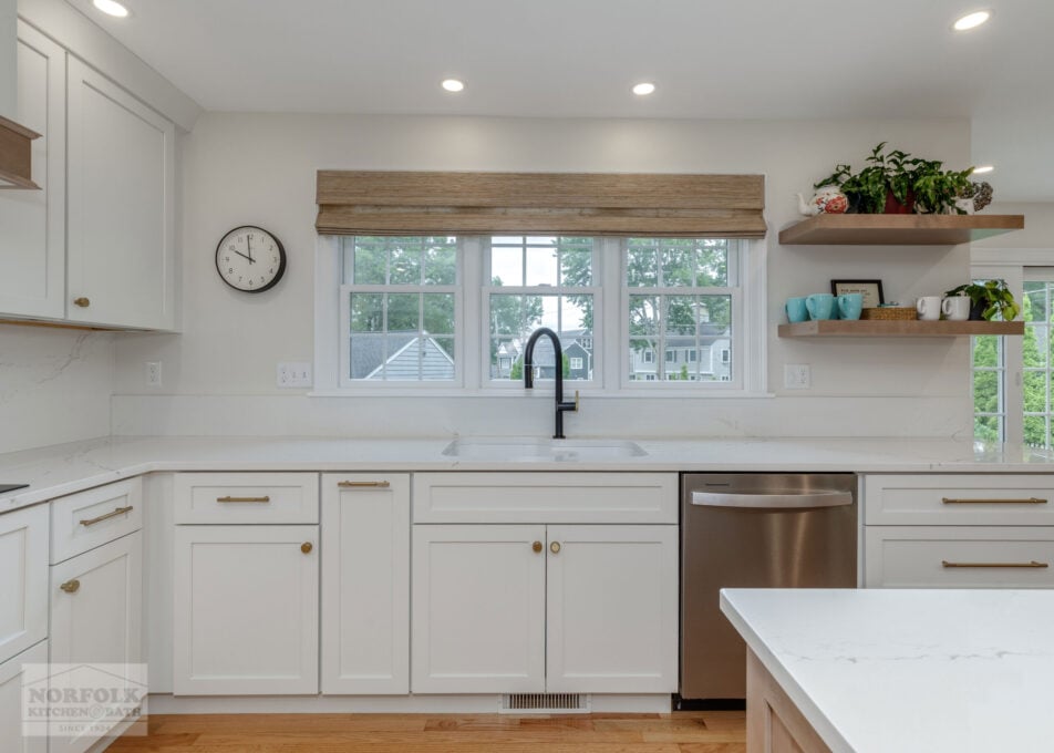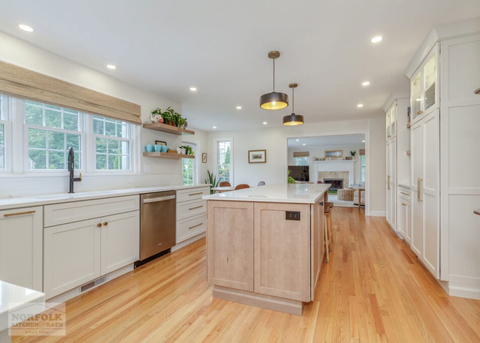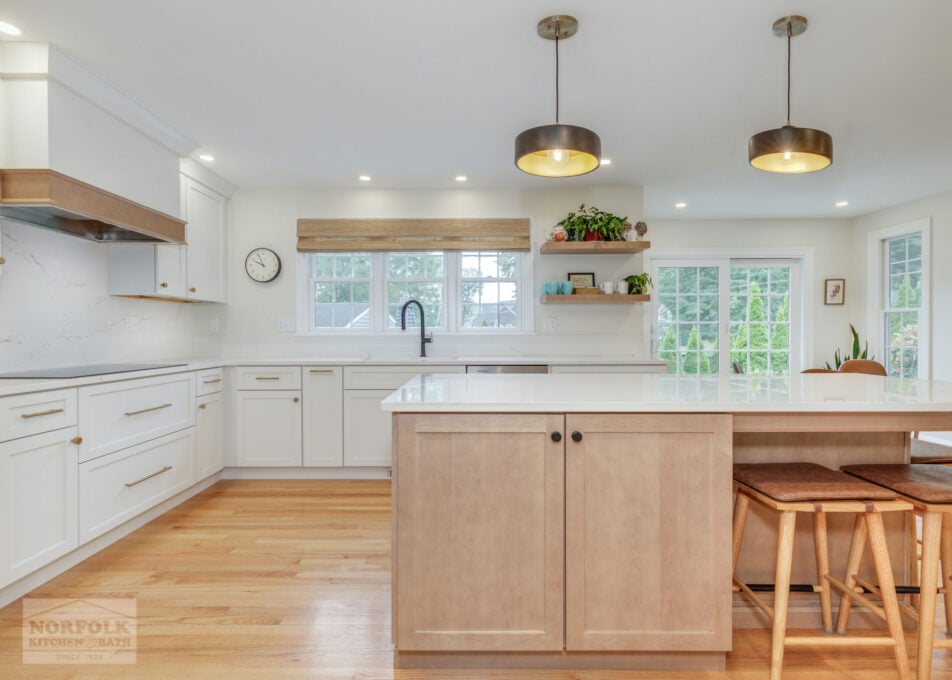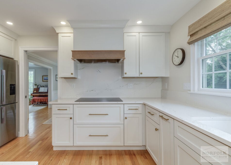 Designed by Kate in our Framingham showroom this beautiful kitchen makeover kept the existing footprint while reworking the design for a fresh, updated feel. Showplace cabinets in White Dove are paired with a light-stained island, beautifully complemented by Cambria quartz countertops and backsplash in a frosty white tone. Special features like magic corners, in-cabinet and undercabinet lighting, spacious pantries, and a custom hood with matching trim add both style and function to this bright and welcoming space.