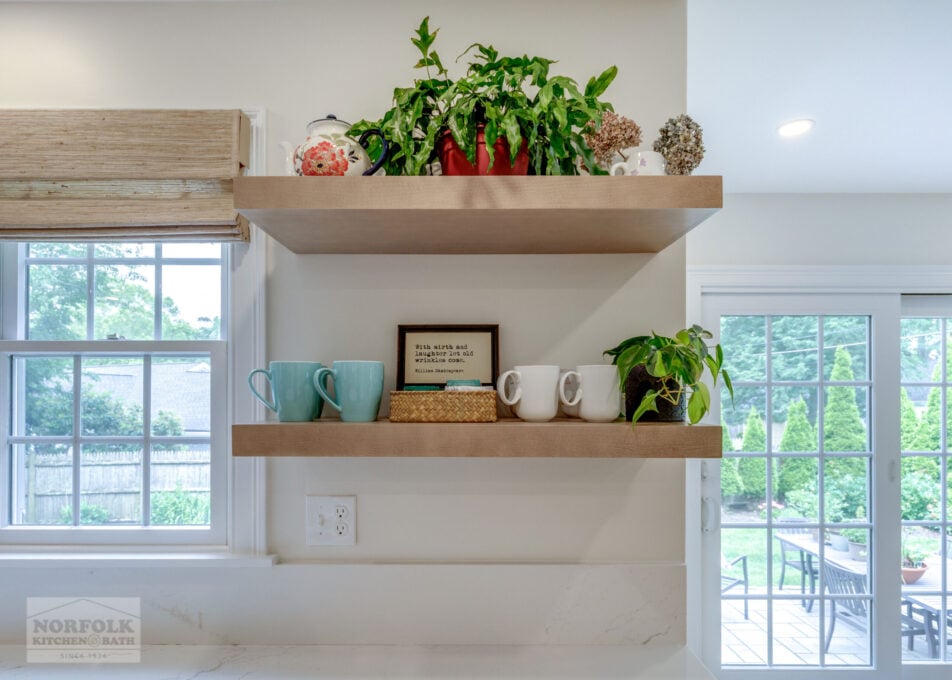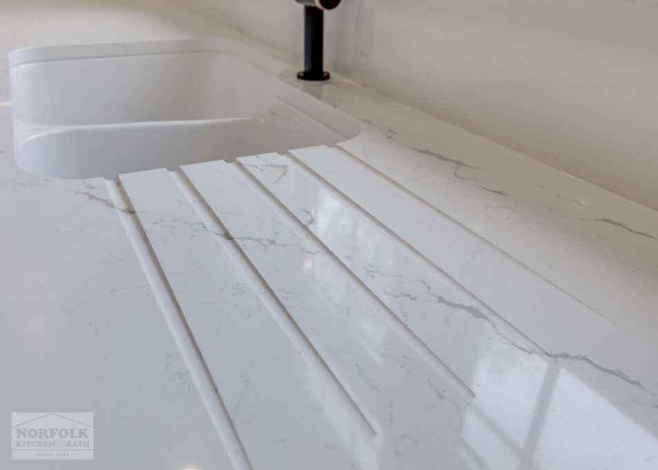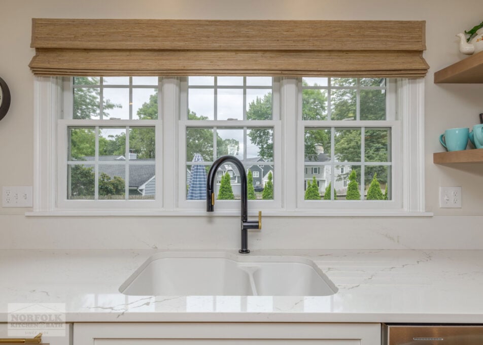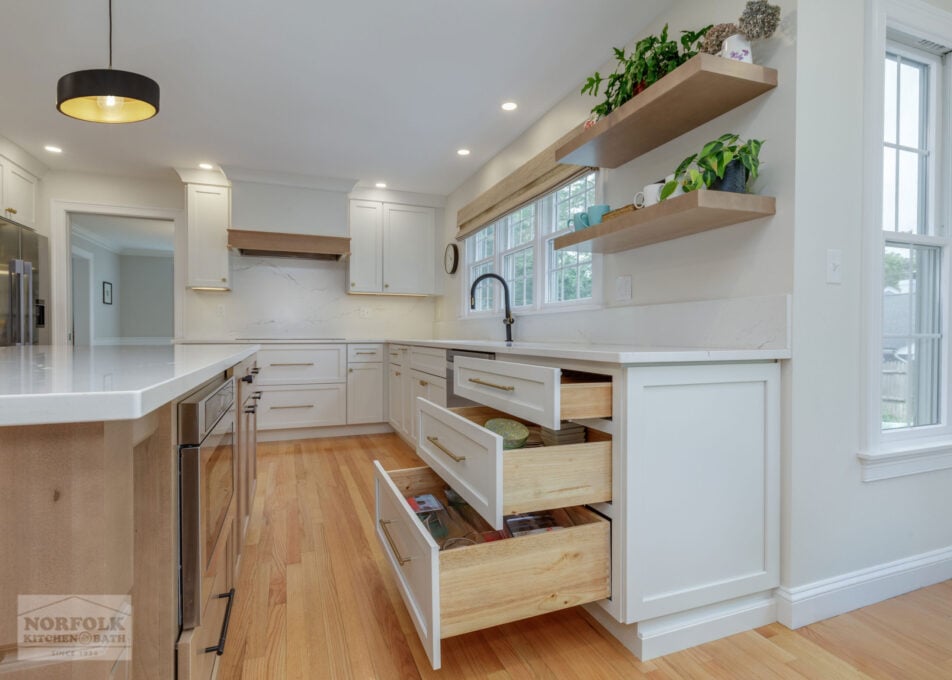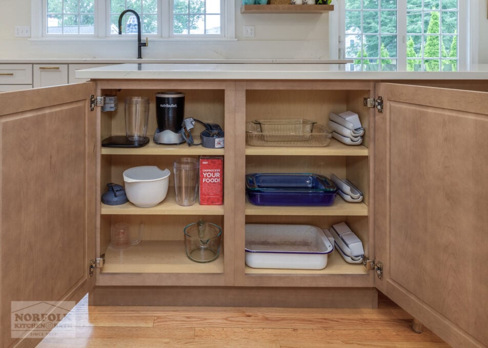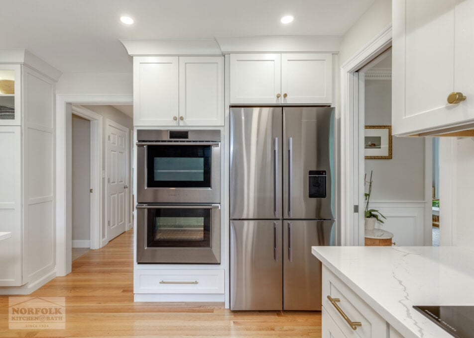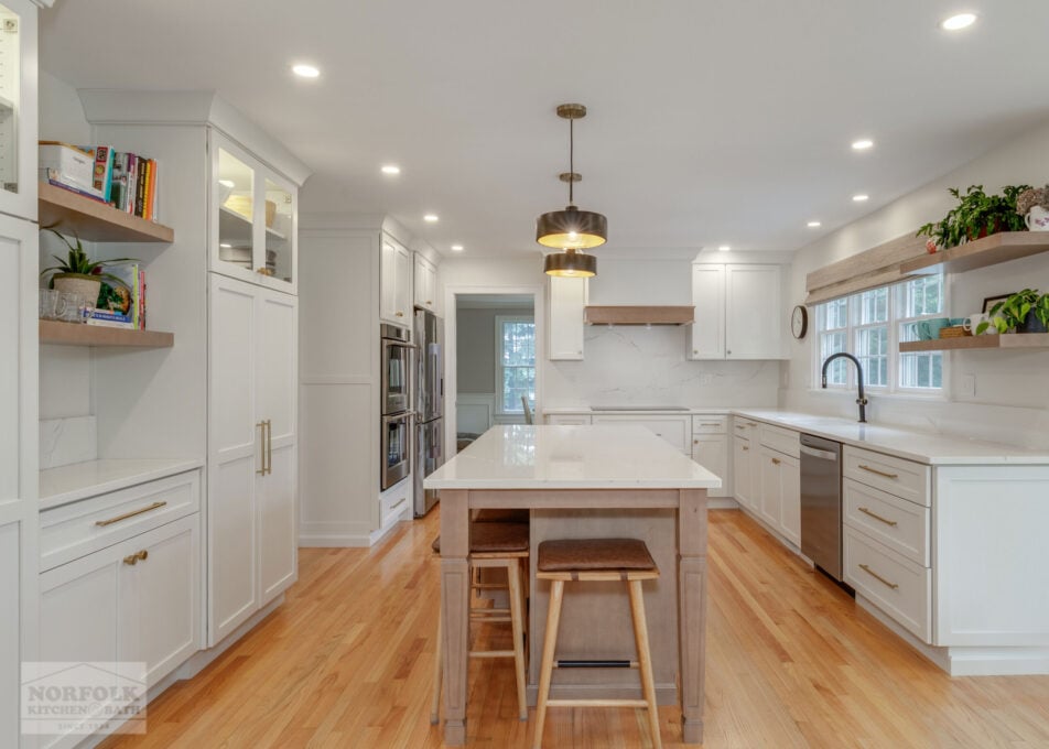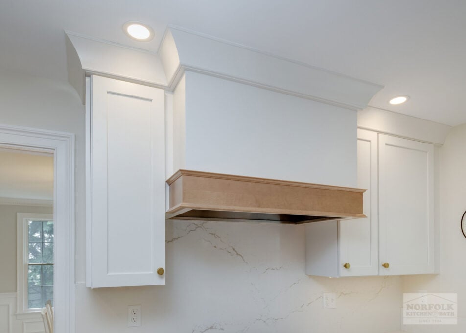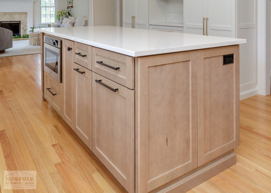 Designed by Kate in our Framingham showroom this beautiful kitchen makeover kept the existing footprint while reworking the design for a fresh, updated feel. Showplace cabinets in White Dove are paired with a light-stained island, beautifully complemented by Cambria quartz countertops and backsplash in a frosty white tone. Special features like magic corners, in-cabinet and undercabinet lighting, spacious pantries, and a custom hood with matching trim add both style and function to this bright and welcoming space.