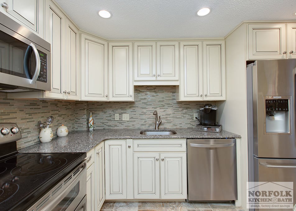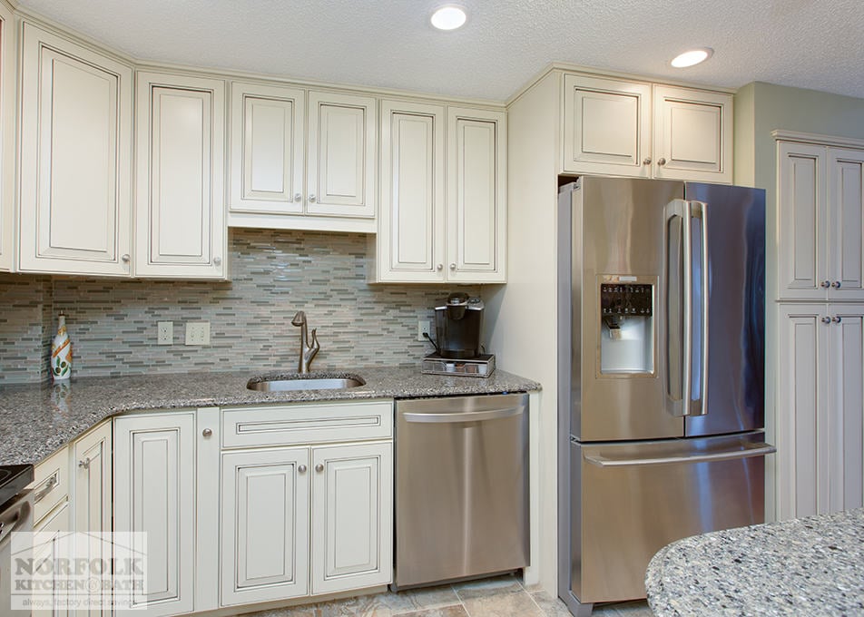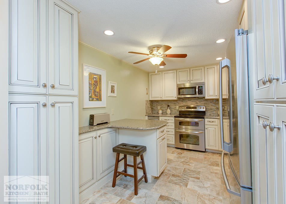 This kitchen remodel was part of a multi – room remodel, designed by Merry in our Boston showroom. The remodel features Echelon cabinetry with a Cambria quartz countertop and stainless steel appliances. The designer also put in a small peninsula for the customer, which provided a great sitting area in a small amount of space. A pantry front was also used to disguise their utility closet door and give the kitchen a finished look.