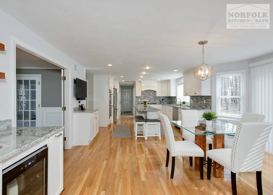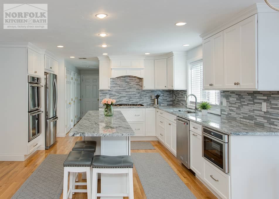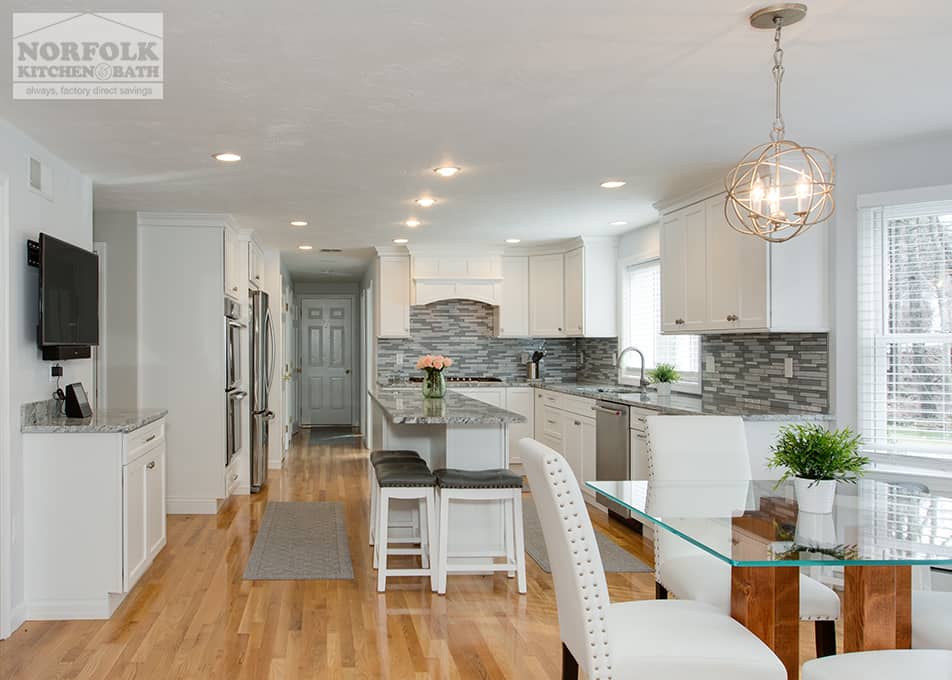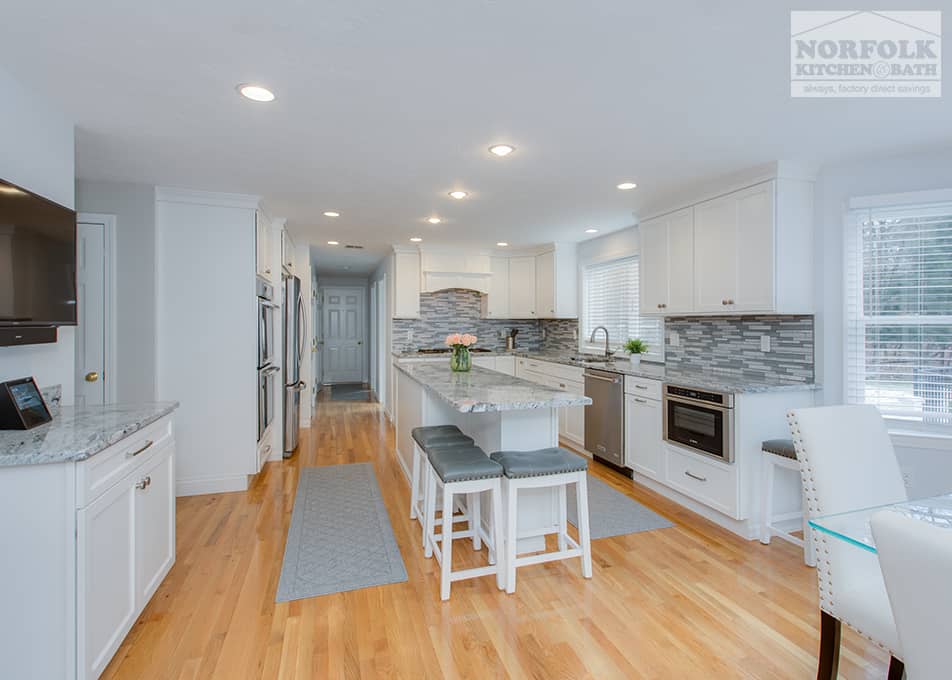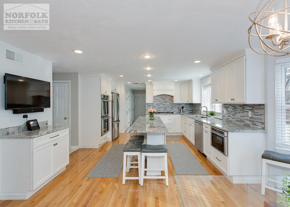 This gorgeous new kitchen was designed by our Braintree showroom. This beautiful transitional design features Showplace white full overlay cabinetry, granite countertops, and modern decorative hardware. Special features in this kitchen include a coffee bar with pull out drawers, a decorative wood hood, a TV cabinet and a unique island design that provides seating for two on one end and room for prep on the other, providing a clear separation for the prep and eating spaces. Stainless steel appliances and a glass mosaic backsplash give this kitchen a finished look.