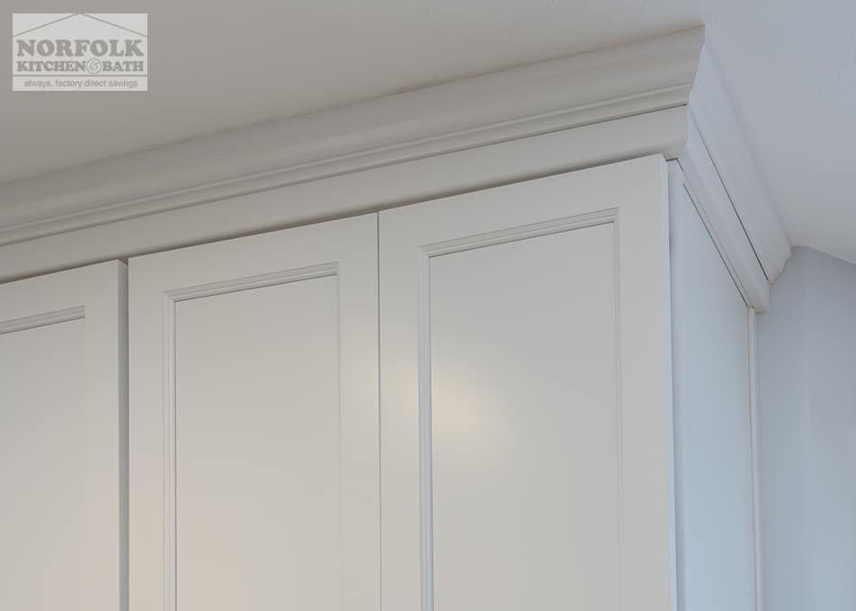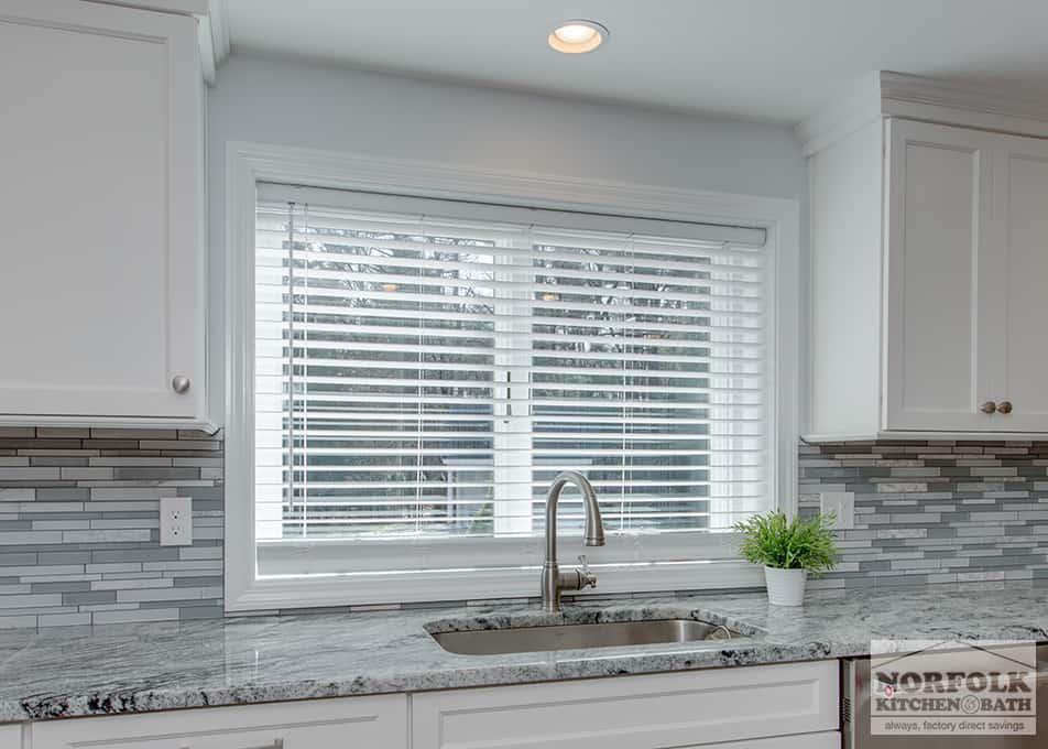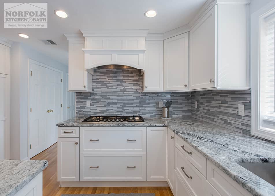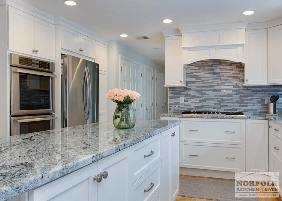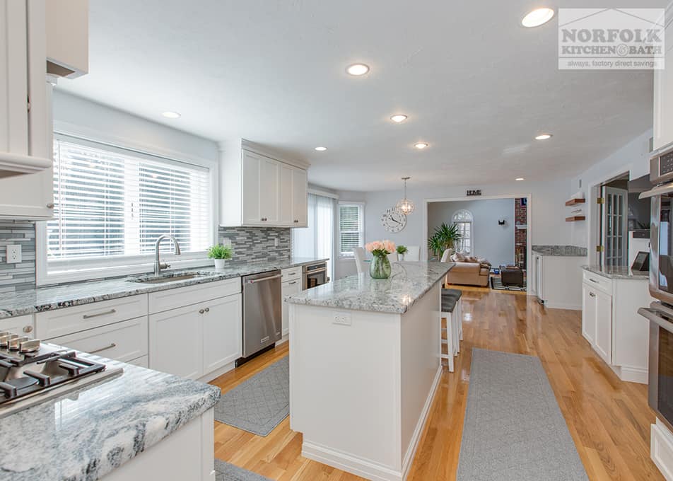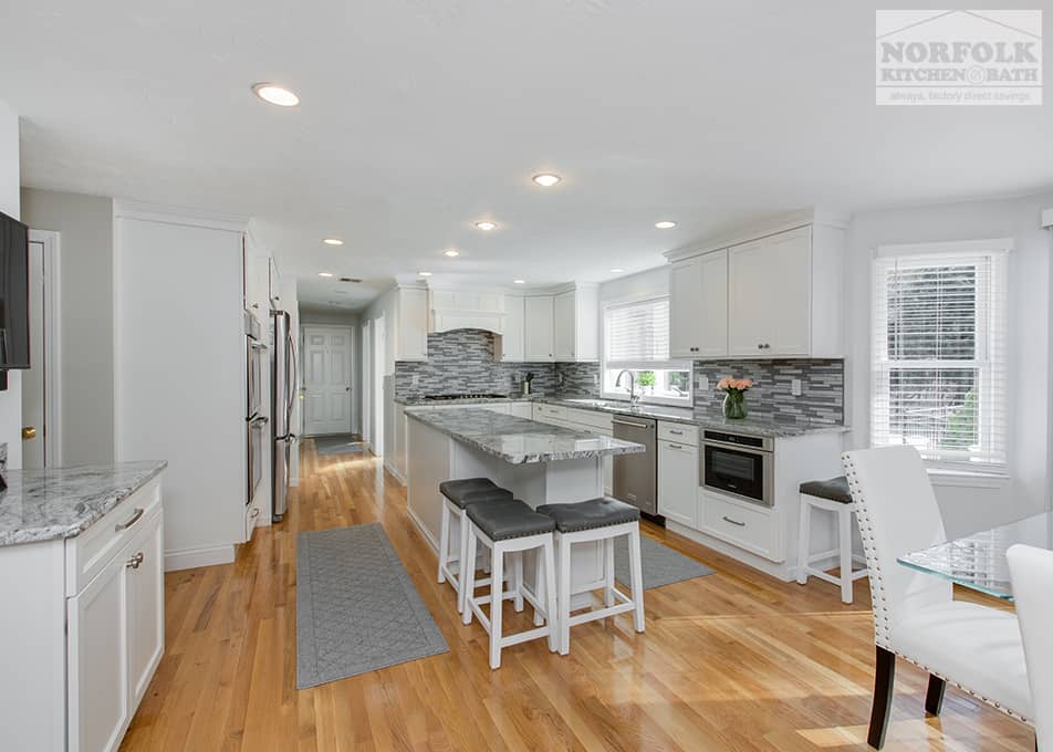 This gorgeous new kitchen was designed by our Braintree showroom. This beautiful transitional design features Showplace white full overlay cabinetry, granite countertops, and modern decorative hardware. Special features in this kitchen include a coffee bar with pull out drawers, a decorative wood hood, a TV cabinet and a unique island design that provides seating for two on one end and room for prep on the other, providing a clear separation for the prep and eating spaces. Stainless steel appliances and a glass mosaic backsplash give this kitchen a finished look.