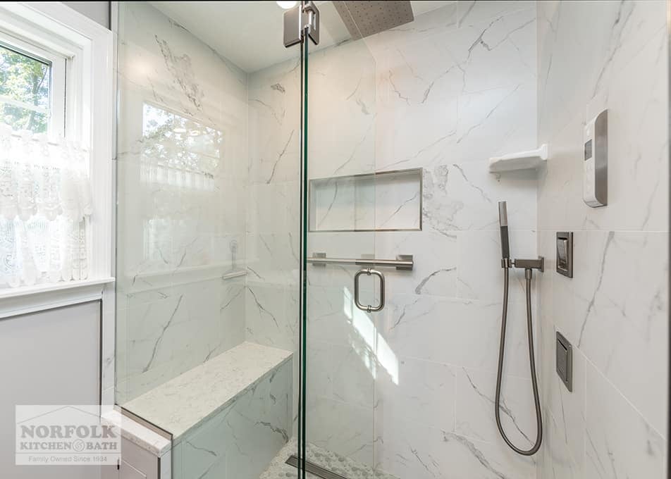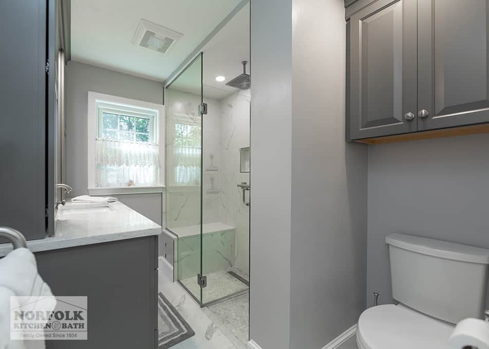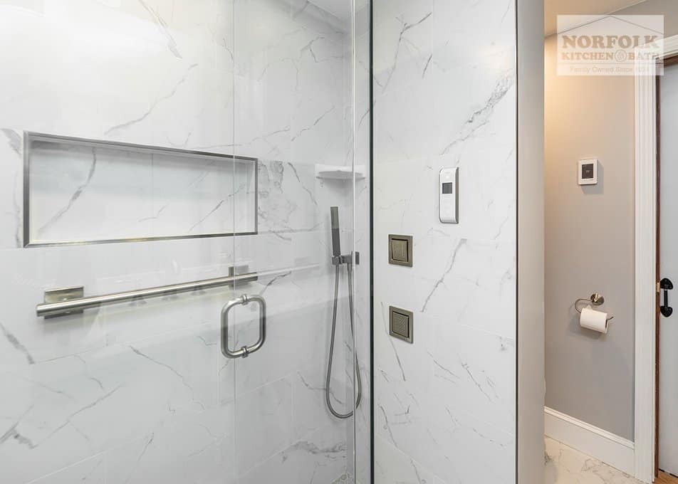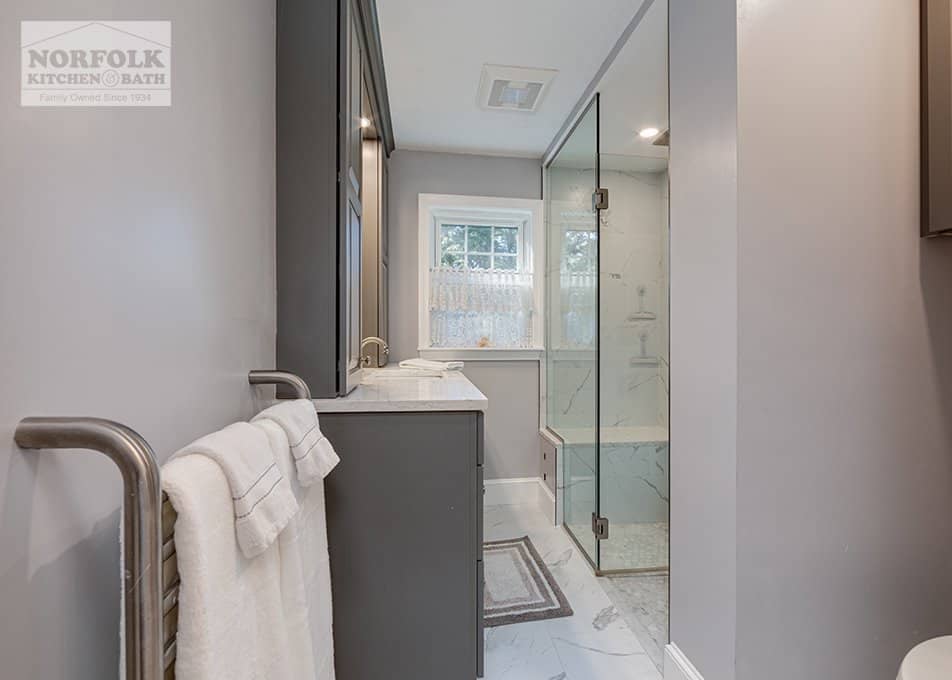 Norfolk Kitchen & Bath also completed the installation for this bathroom, which included demolition, plastering, electrical, plumbing, cabinet installation, tile installation, and various carpentry. Take a look at some of the photos below!