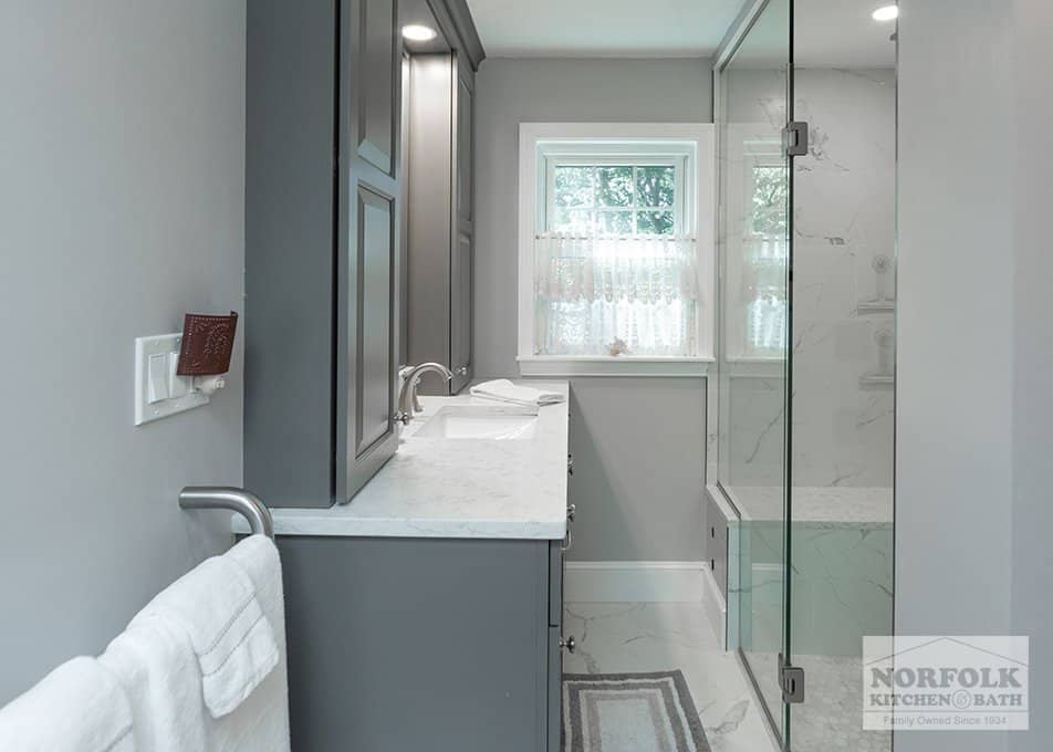This beautiful master bath remodel was designed by Lindsey in our Braintree showroom. This narrow but luxurious bathroom truly maximizes the available space, and features a custom bath vanity with a raised panel door and lots of storage, a quartz vanity top, crown molding, a matching toilet topper, and a custom spa shower. The shower design features an open-concept glass enclosure, marble tile, shower jets & a contemporary rainfall showerhead. The remodel also included the addition of radiant heat flooring throughout, a custom vanity mirror, toilet replacement, and tiling.