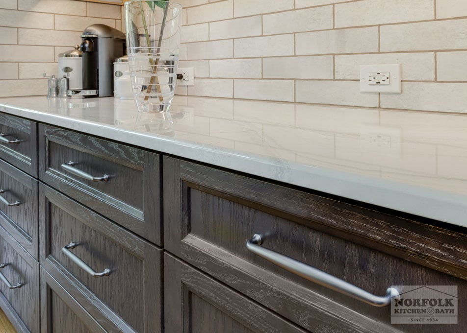 This beautiful kitchen was designed by Kate in our Framingham showroom. The detailed shaker cabinets feature a sophisticated two-tone finish, with light mocha for the wall cabinets and peppercorn oak for the base cabinets and island, creating a balanced and inviting look. Quartz countertops add durability and elegance to the design.
