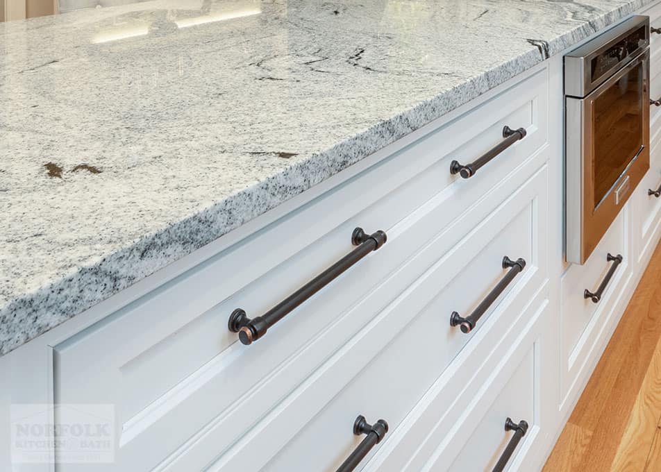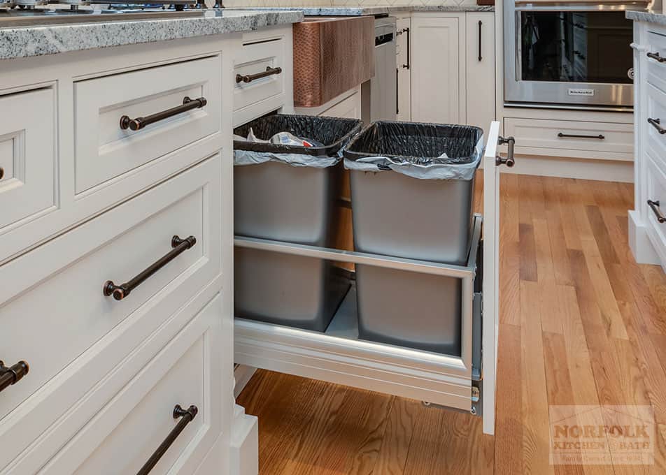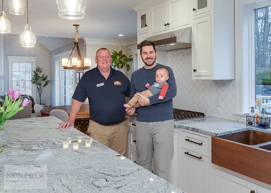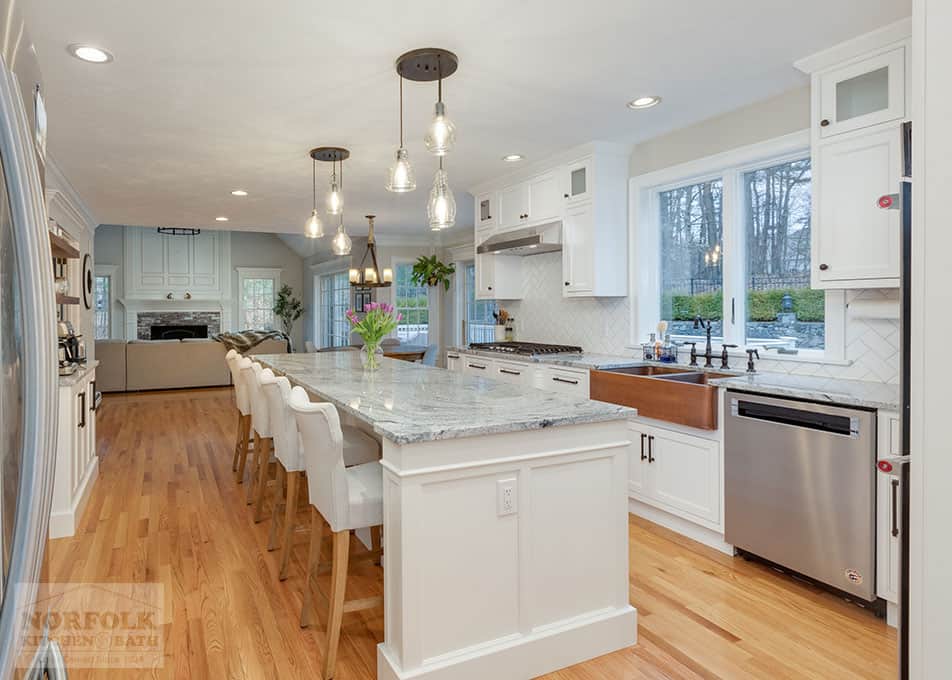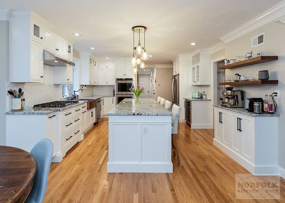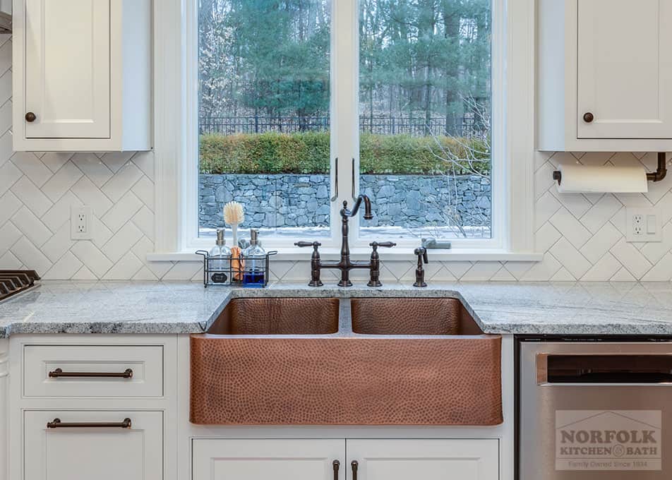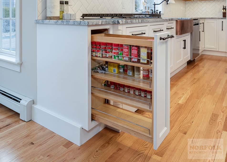 This inset white shaker kitchen was designed by our Framingham showroom, and features an inset shaker cabinet door, granite countertops, a beautiful white herringbone tile backsplash, a copper apron sink, and stainless steel appliances. This kitchen is loaded with storage upgrades & special features for a growing family, including: stacked cabinets, a double trash cabinet, coffee mug storage (a *must* for new parents!), a spice pull-out drawer, a beverage station with floating shelves, a pantry, pots and pans storage, a wine rack, and so much more. Finished end panels, crown molding, and furniture posts near the stove give this kitchen a high-end, finished look.