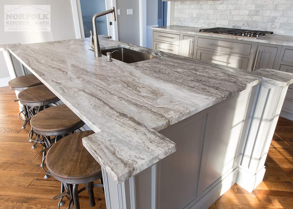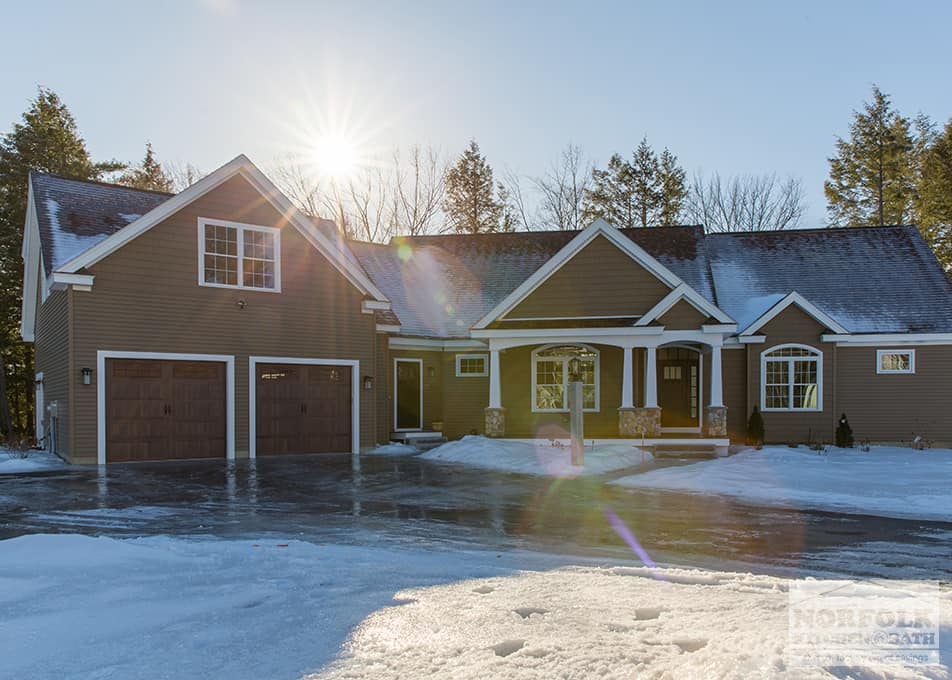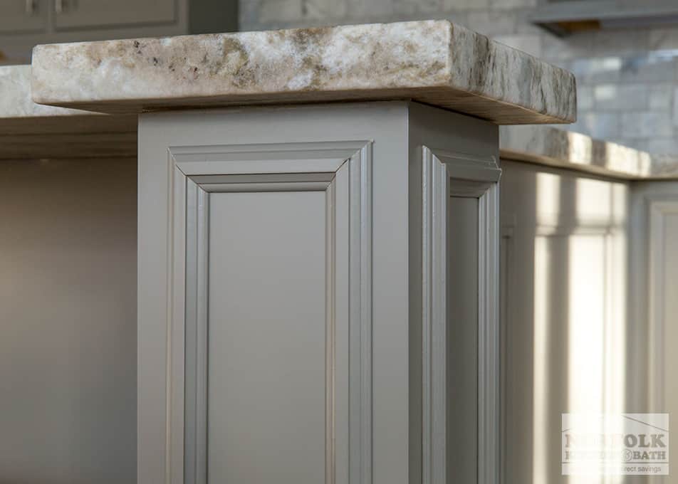 This beautiful new kitchen was designed by Mariah from our Manchester, NH kitchen showroom. The design features a detailed shaker cabinet door with a honed granite countertop, an island with custom built posts, as well as industrial-looking lighting and exhaust hood. The island posts were built on site, and give the island a true custom feel.