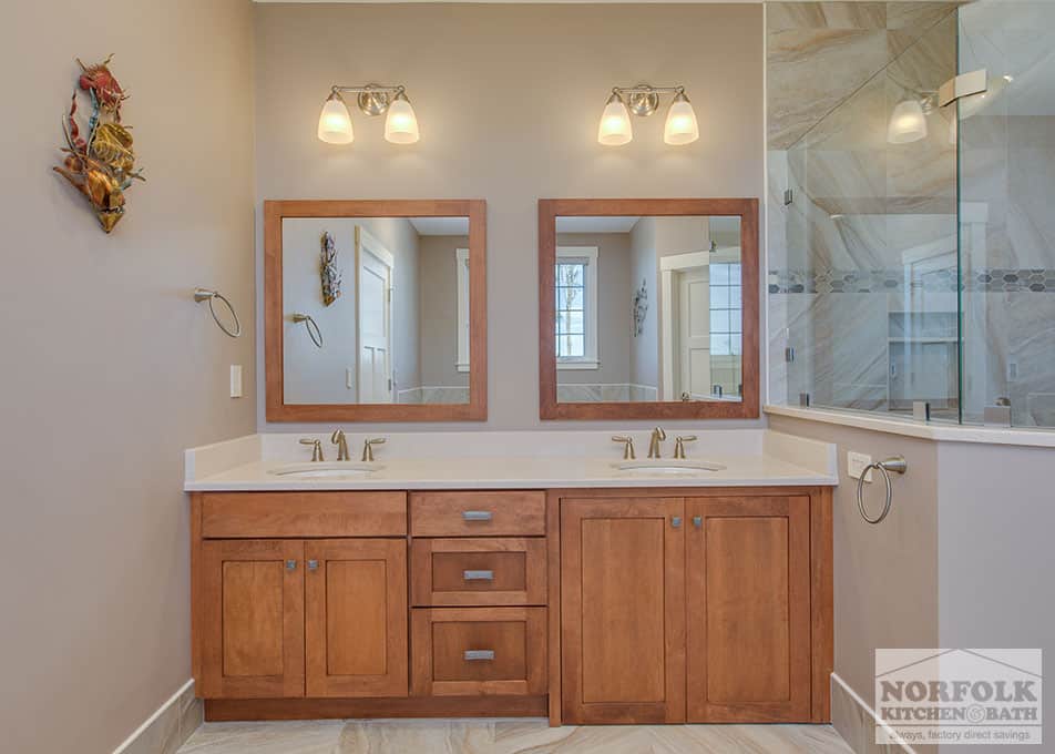 These bathrooms are part of a beautiful, comprehensive home cabinetry design by our Nashua showroom. These are in a newly constructed ADA home, designed specifically around the homeowners’ needs and disability. All bathrooms feature flat-panel door style with a medium matte finish and quartz vanity tops. The master bathroom also features a gorgeous walk-in shower and a seating bench, ideal for someone with a disability to navigate without much assistance. Cabinet doors underneath the sink hide the plumbing, which functions as an opening to allow someone in a wheelchair to get close enough to the sink. An absolutely beautiful home with all the features needed to assist the homeowner with everyday life.