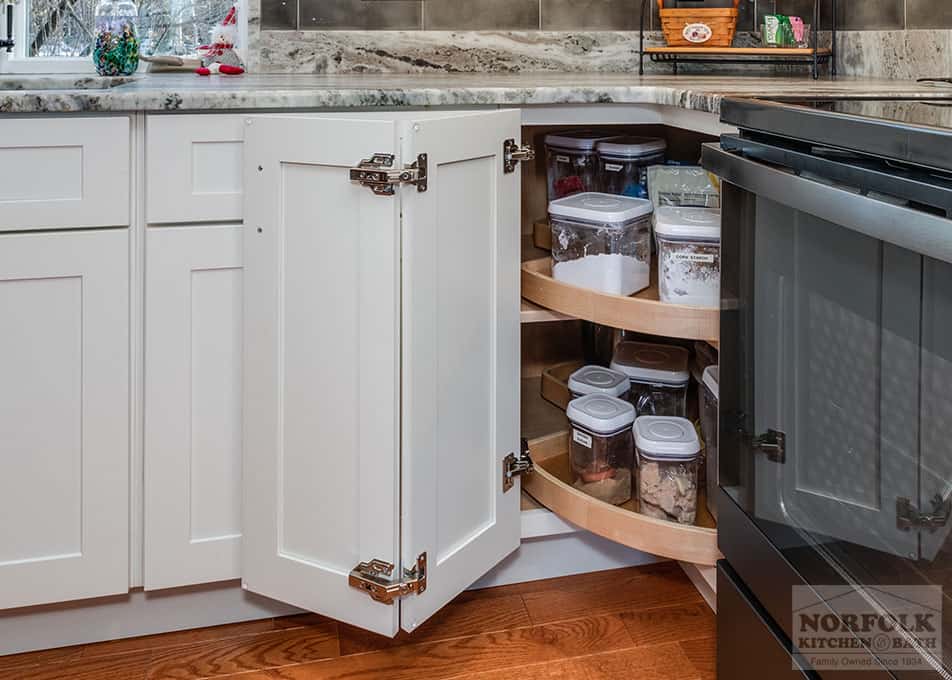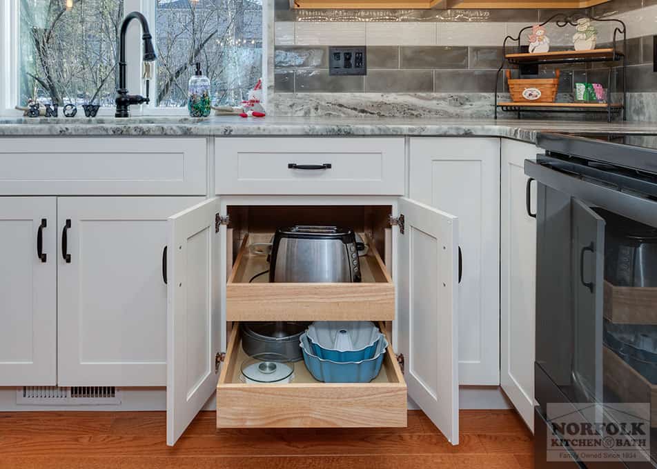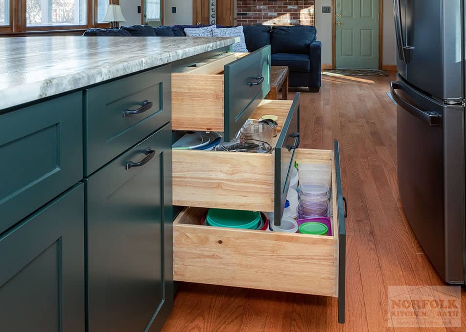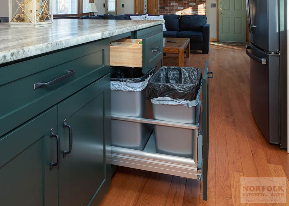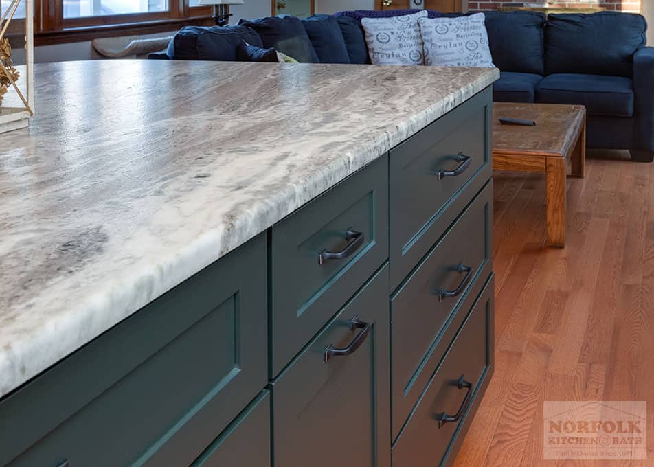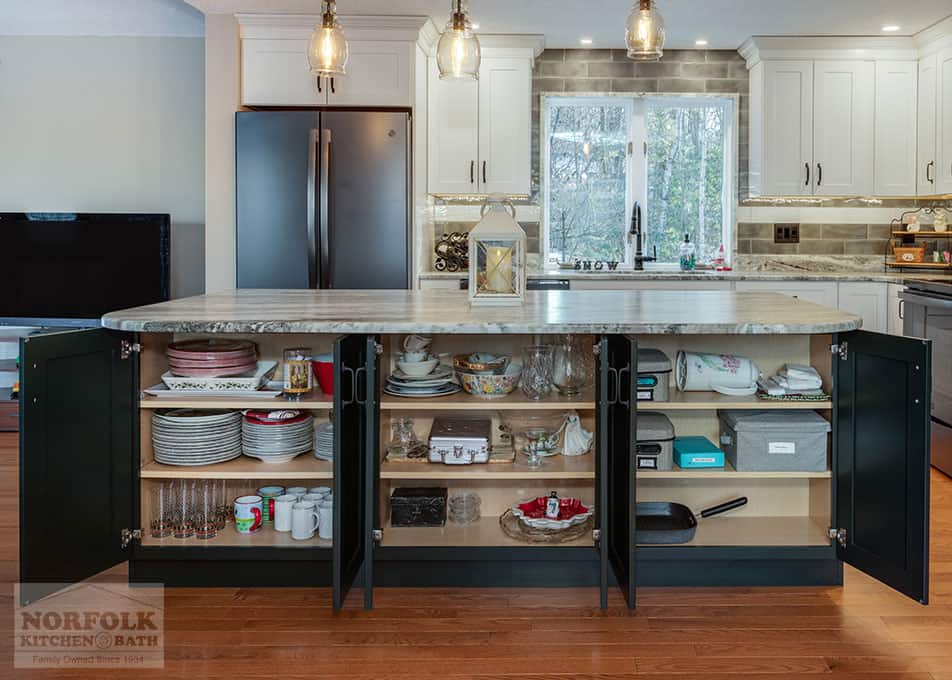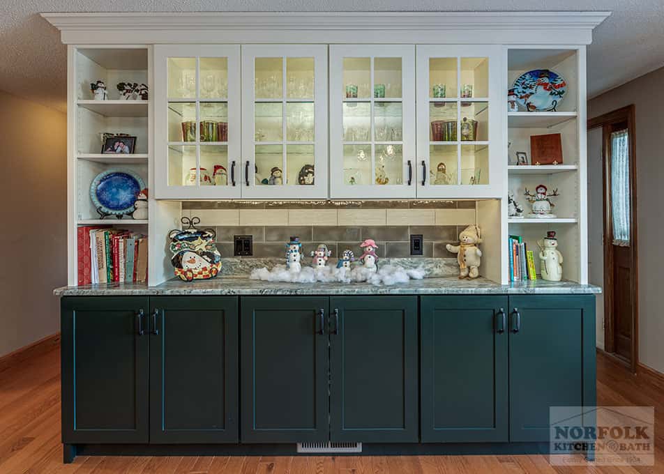 This beautiful kitchen remodel was designed by Mariah from our Manchester, NH kitchen showroom. This remodel was completed as a result of taking down a wall to open up the kitchen to the dining space. The design features a shaker door cabinet in off-white and green finishes, with stone countertops, a large island for storage and seating, stainless steel appliances & a matching hutch area for extra glassware storage. Special cabinet upgrades include a two-tiered cutlery drawer, roll-out trays, glass cabinets with glass shelving, and bookcases. Check out the photos below!