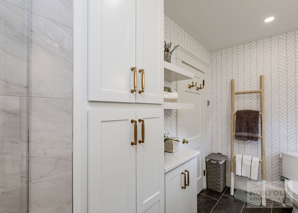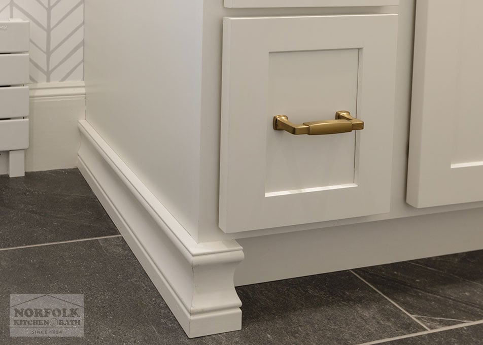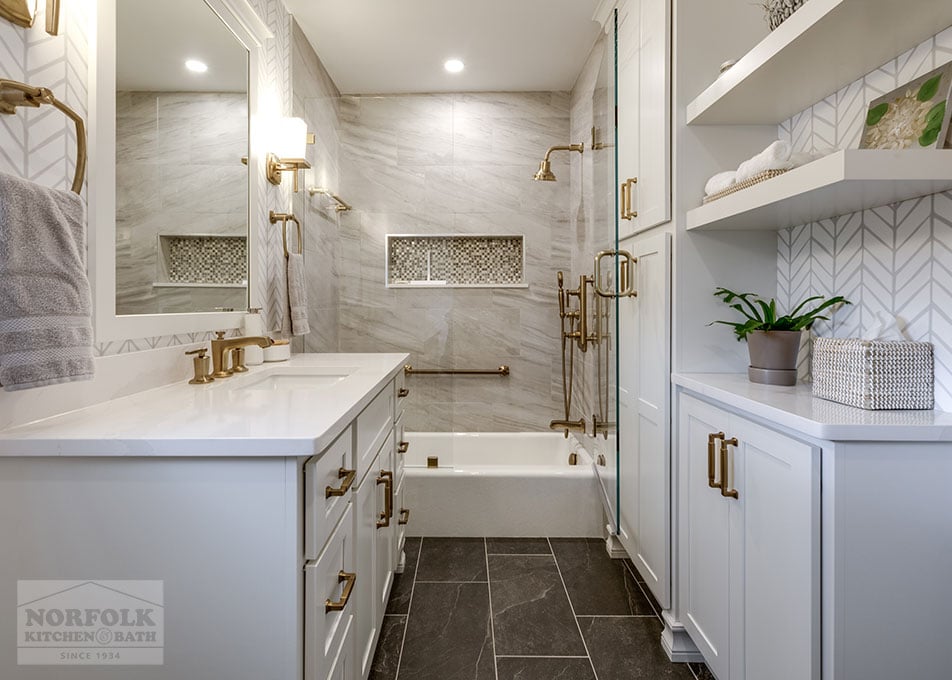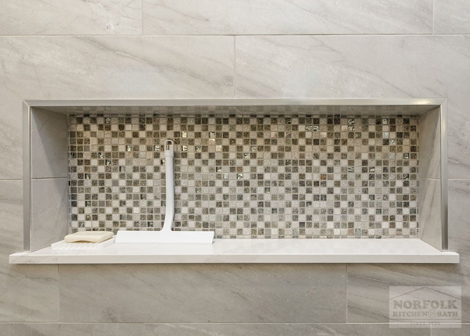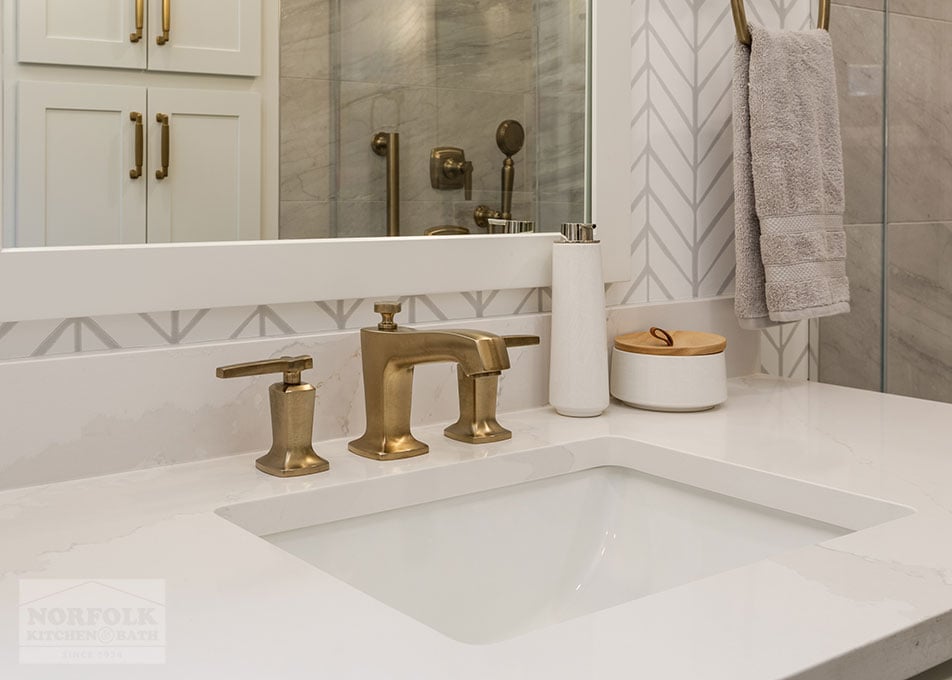 This beautiful master bathroom remodel was designed by our Framingham showroom. The design features a shaker door style from our Designer collection in a white finish, with a gorgeous Silestone quartz vanity countertop.